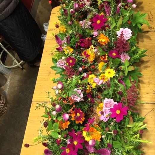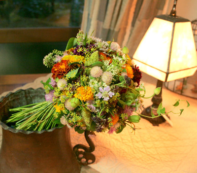 花を並べるだけではなく、軽い凹凸を全体に散りばめて、花と花、色と色をつなぐように束ねていきます。